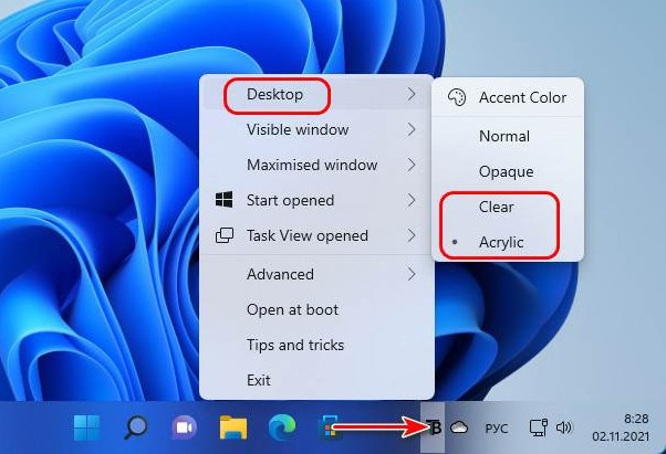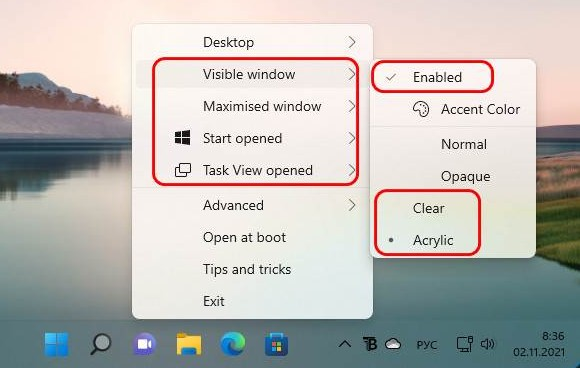 Полностью прозрачная панель задач выглядит особенно органично в связке с дизайном Windows 11, в частности в светлых темах оформления. В то же время эффект акрила универсален и эффектно смотрится в любых темах. Программа работает в фоновом режиме, а все настройки доступны через значок в системном трее.