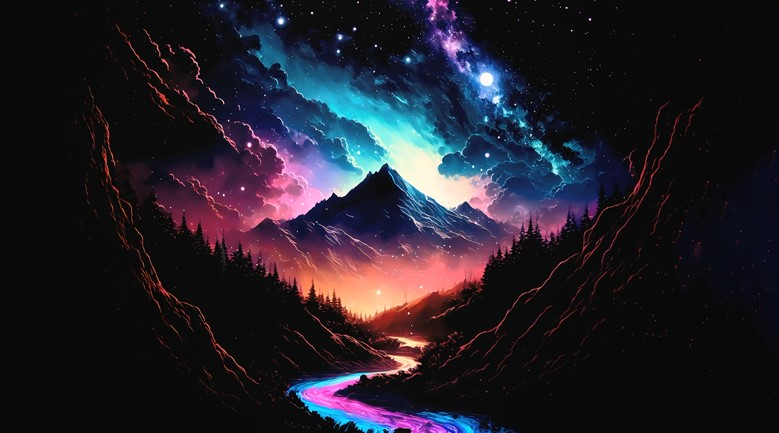 Горные силуэты тёмные, почти чёрные, между ними река, гладь воды ловит неоновый свет неба. Вдалеке одна гора подсвечена снизу розовым, как будто изнутри светит лампочка. За горой яркое неоновое сияние, контраст с чёрным небом броский, но приятный, звёзды тихо мерцают, не перекрывая главный свет. Живые обои тут работают как маленький спектакль, мерцание, плавный ход света по воде, тихая динамика в тенях. Река чуть пульсирует, гора меняет тон, сцена живёт сама по себе. На рабочий стол такое оформление зайдёт легко и не будет мешать делам.