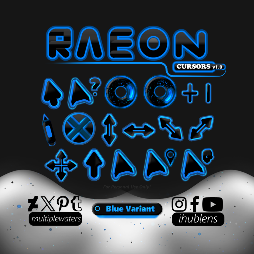 Raeon — это набор стильных черно-синих курсоров в неоновом стиле, идеально подходящих для персонализации рабочего стола с темной или ночной окраской. Основной указатель выполнен в знакомой классической форме с "хвостом": большая площадь залита черным, а по контуру проходит ярко-синяя окантовка, создающая эффект неонового свечения. Другие курсоры в наборе отличаются более широкой задней частью и двойным острием, что придает им уникальный, динамичный вид. Анимация загрузки оформлена оригинально вокруг курсора движутся искры, добавляя визуальной живости и подчеркивая футуристический стиль.