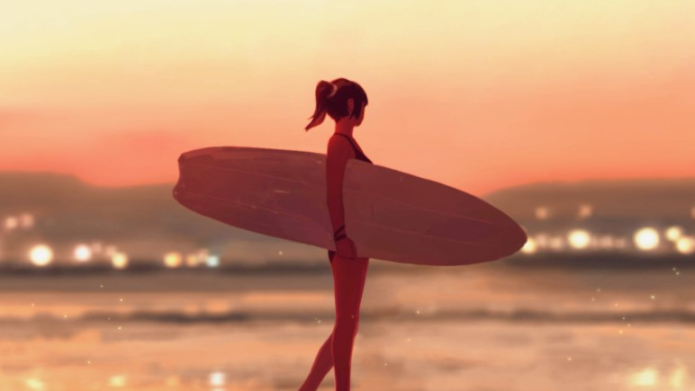 Девушка идёт вдоль берега, доска подмышкой, шаги мягко тонут в мокром песке. Свет ложится на доску и волосы, цвета плавно меняют тон от тёплого коралла до бледного пурпура. Волна катится к берегу, всё движется тихо, без резких скачков, плавные волны, медленное мерцание неба, лёгкое покачивание волос. Подойдёт в качестве заставки и не будет мешать работе, можно смело ставить на рабочий стол если хотите спокойный фон на рабочем столе, выберите режим с пониженной анимацией и эти живые обои на ноутбук останутся лёгкими и ненавязчивыми напоминанием о лете.
