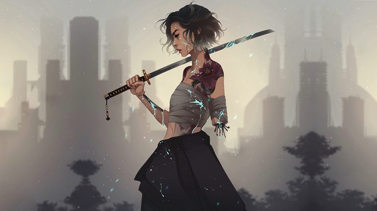 Девушка-киборг, судя по всему после жестокой схватки, из культи оставшейся от левой руки, торчат обрывки проводов в другой руке сжимает острый японский меч, тело забрызгано голубой кибернетической кровью. За ней скрывается туманное очертание города, где смешались дым и серые постройки. Короткая стрижка и большая татуировка на плече дополняют серьёзность и сосредоточенность взгляда, что будто проникает сквозь пространство. Эти живые обои отлично подойдут всем, кто хочет добавить на рабочий стол что-то необычное анимированная девушка в атмосфере киберпанка создаст живой фон, который не оставит равнодушным. Такая заставка не просто украшение, а целая история, оживающая на экране ноутбука, это движущиеся обои на весь экран, которые зададут настроение и вдохновят в моменты работы или отдыха.