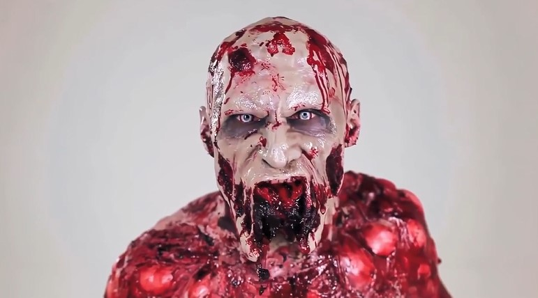 Seorang zombi menatap keluar layar, wajahnya berlumuran darah, matanya berkilat, bibir bawahnya robek, napasnya nyaris tak terdengar, dadanya naik turun, bibirnya bergetar, tetesan darah menetes pelan di pipi, meninggalkan jejak tipis. Warna mata berubah dari kuning kusam menjadi merah menyala untuk sesaat. Animasinya terkendali, gerakan mata, napas lambat, dan tetesan darah mengalir dengan lancar. Ini bukan efek kejutan, melainkan adegan halus dan muram yang menarik perhatian tanpa terasa mengagetkan.