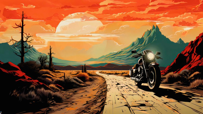 Evening and desert, a country road stretches into the distance, and next to it sits a simple, sturdy motorcycle, as if ready for its next journey. The sun slowly sets behind the horizon, painting the sky with soft hues that seamlessly transition into the vibrant background of your screen. This shot is a great idea for a live wallpaper for your laptop; moving wallpapers add a cozy and unique atmosphere, as if you were right there on the road. This screensaver conveys a sense of freedom and ease, perfect for those who appreciate moments of silence and reflection. The motorcycle, a symbol of movement and adventure, stands calmly here, reminding you of the upcoming start. If you want to liven up your desktop, an animated scene with this motorbike will create a special mood across the entire screen, not distracting, but inspiring.