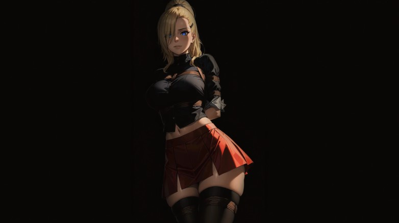 Тёмный фон, одинокая фигура в короткой коричневой юбке, смотрит, сдержанно и загадочно чуть в профиль, взгляд ушёл в сторону, лёгкая складка ткани и едва заметный ветерок в волосах создают ощущение движения. Поза непринуждённая, руки вдоль корпуса, плечи расслаблены, лицо сдержанно, как будто мысль вот-вот решит выйти наружу. Анимация тихая и экономная, слегка колышущиеся пряди, мерцание на краях юбки, редкие вспышки в фоне. Подходит на рабочий стол в качестве живых обоев не отвлекает и бережно расходует ресурсы.