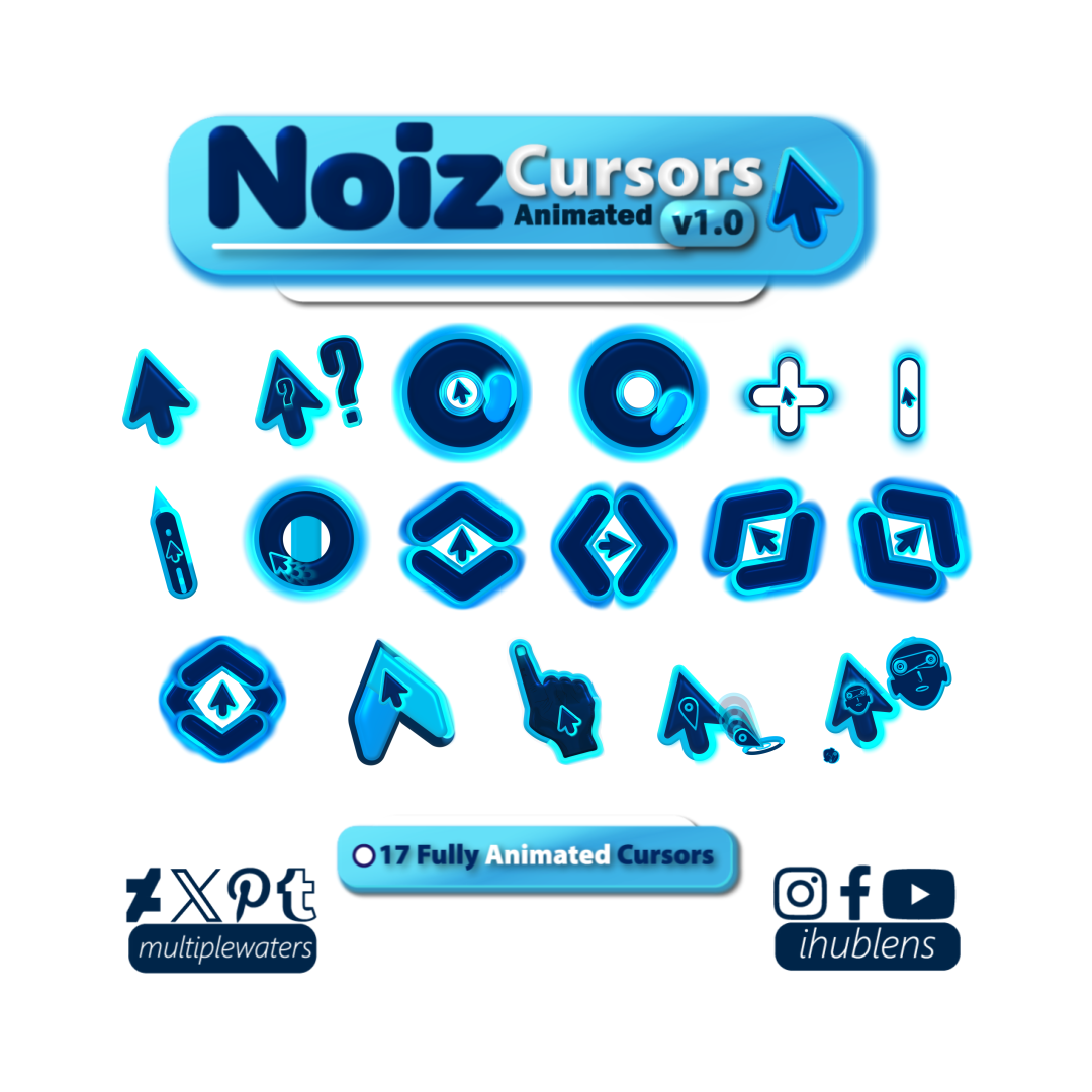 Яркая синь, полная огня — так зовётся набор курсоров «Noiz». Где тьма встречает светло-голубое сияние, появляется четкая стрелочка мышки с подсветкой, будто будто кайма из ледяных искр. Линия, что скользит по краю, не статична, она будто змейка шустрая — движется и манит взгляд, добавляя живости. Острый нос знаком тебе давно, хвостик — классика, но не стоит думать, что всё так просто. Внутри этого пакета растут целые истории — разные формы, что выскакивают в неожиданных местах, превращая обычный указатель в настоящую фишку рабочего стола. Крутость «Noiz» не в яркости, а в игре теней и света, хочется смотреть и использовать, потому что даже маленький курсор способен сделать экран живым и особенным.