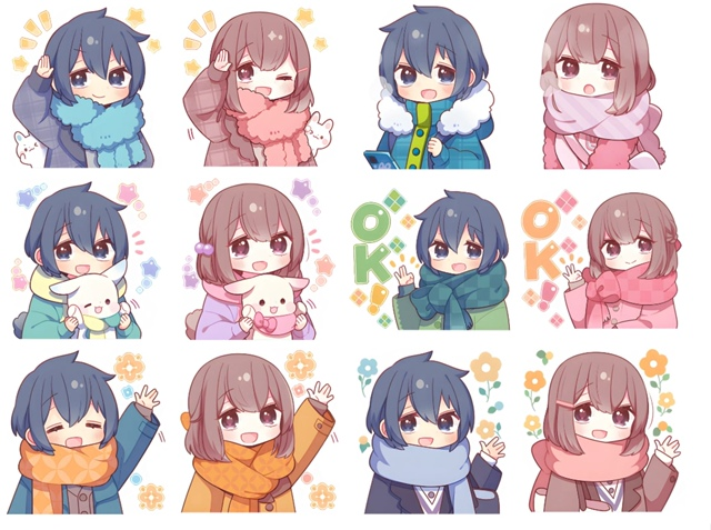 Коллекция из 40 стикеров в аниме-стиле, где два персонажа мальчик и девочка укутаны в зимние шарфы и куртки. Они передают разные эмоции от приветствия и подмигивания до тёплых объятий с кроликом. В некоторых стикерах появляются цветы и надписи, что добавляет настроение и смысл. Такие стикеры отлично впишутся в новогоднюю переписку Telegram или другие мессенджеры, а ещё подойдут для Twitch, где эмоции и яркие картинки важны. В них можно найти готовые emoji-статусы или использовать для дизайна чатов, чтобы сделать общение уютнее и живее.