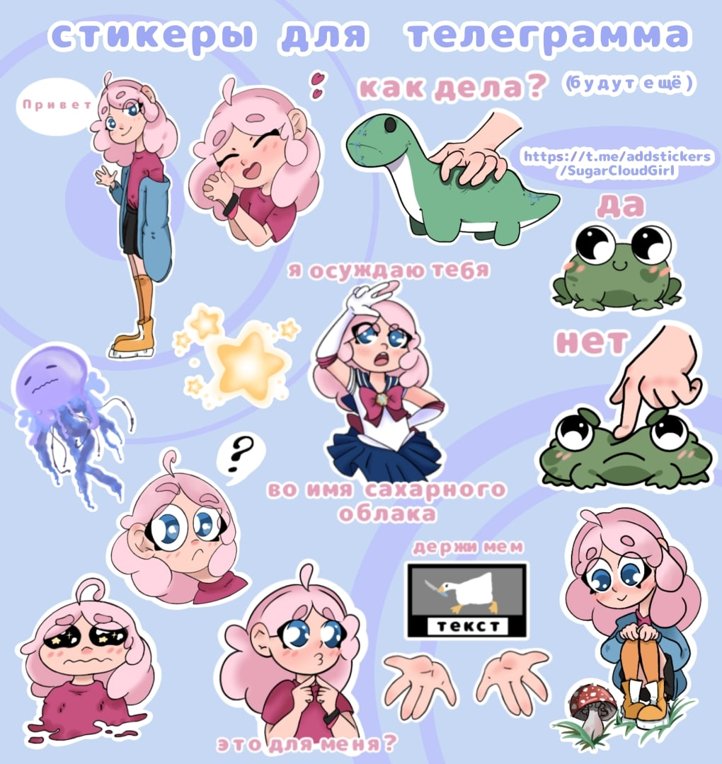 В наборе 17 стикеров для Telegram, объединённых одной атмосферой и героями, которые легко запомнить. Девушка с розовыми волосами словно из аниме встречается с динозавром, медузой и лягушками каждая картинка передаёт эмоции и добавляет живости в мессенджеры. Такой набор эмодзи оживит переписку и отлично впишется в дизайн для Twitch или других платформ. Форматы PNG, JPG и WEBP дают простоту использования, а стикеры выглядят легко и выразительно, помогая добавить индивидуальный штрих в чат.