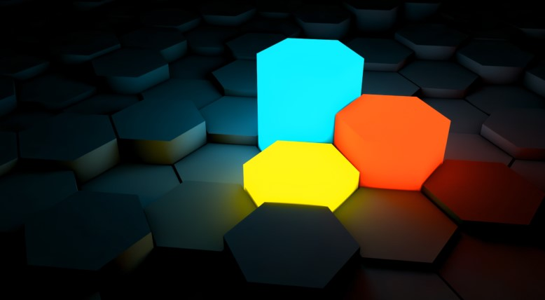 Темный фон, множество шестиугольных призм, как клетки улья. Большинство матово-тёмно-серые, но в переднем плане три призмы горят: жёлтая, оранжевая и голубая. Контраст света и тени даёт ощущение глубины, как будто поверхность уходит внутрь, а яркие грани выдвигаются вперёд. В анимированной версии грани едва заметно смещаются и играют бликами, создавая спокойное, немного гипнотическое движение являя собой отличное решение для живых обоев на пк для тех, кто любит лёгкие движущиеся обои.