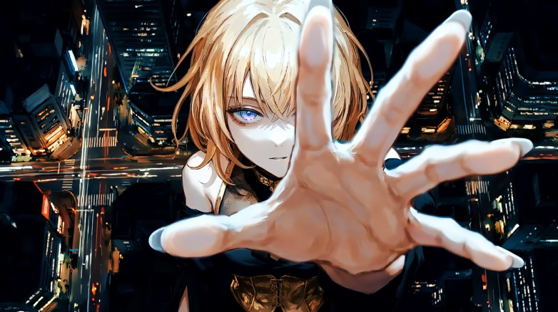 На экране оживает светловолосая девушка с ярко-голубыми глазами, она протягивает руку, словно приглашая взглянуть ближе и почувствовать момент, живой фон, который не просто украшает, а создаёт особое настроение. Город за спиной мягко мерцает, а сама картинка не статичная заставка, а движущиеся обои, которые добавляют глубины и жизни твоему рабочему столу. Такой «живой» образ будто приглашает заглянуть в другую реальность, где всё меняется и движется вместе с тобой.