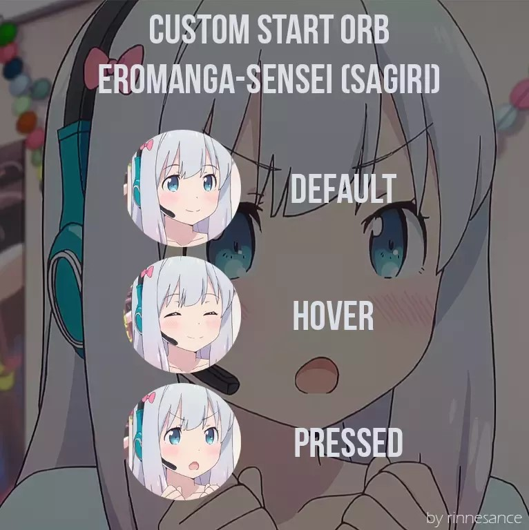Эроманга сэнсэй предлагает свежий взгляд на кнопку ПУСК в Windows, объединяя аниме-стиль с интерфейсом. Вместо привычного значка тут круглая кнопка с лицом Сагири она будто живёт на панели задач. Улыбка по умолчанию сменяется глазами, которые при наведении закрываются и делают выражение ещё милее. Нажатие меняет настроение на строгое и хмурое, будто кнопка ПУСК сама взывает к главному меню, но с характером. Такая тема для кнопки ПУСК Windows выходит за стандарт, превращая настройку внешнего вида кнопки «Пуск» Windows в маленький момент радости для фанатов и тех, кто не боится немного яркости в привычном интерфейсе.