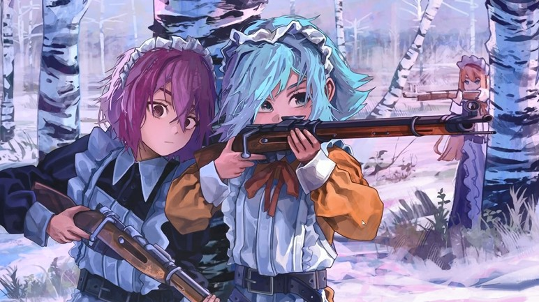 Зимний лес, берёзы в снегу и тихая, немного жуткая сцена. Две горничные в форме держат винтовки: слева фиолетовые волосы, справа голубые. На заднем плане ещё один персонаж, всё выполнено в чистом аниме-стиле, с контрастом мягкой одежды и острого оружия. Может быть связано с синглом "Hush" (2024) — ощущение трека видно в каждом кадре. Подойдёт для поста, обложки или атмосферного стенда в профиле.