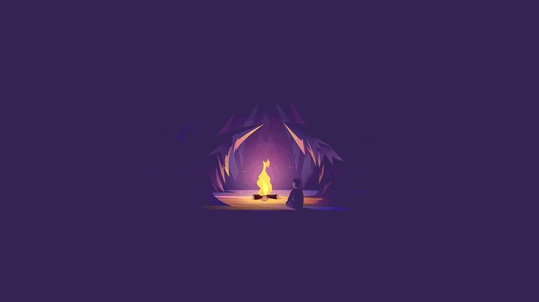 Минималистичная цифровая иллюстрация «Мирный походный костер», человек сидит у костра в тёмном укрытии, вокруг глубокие фиолетовые тени, а пламя горит ярко желто-оранжевым. Простые формы, мягкий контраст и едва слышимая динамика создают ощущение уединённого тепла и спокойствия. Подойдёт как живой фон и живые обои на пк, двигающееся пламя добавляет жизни, но не мешает сосредоточиться.