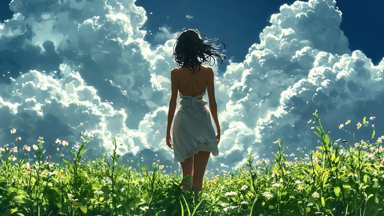 Девушка в белом платье стоит в поле цветов под ярким небом с кучевыми облаками. Ветер чуть колышет платье и траву, облака медленно плывут, сцена нежная и тихая. Это анимированная работа в стиле аниме, созданная фанатами. Плавные движения и простая гамма делают кадр ую́тным, поэтому её удобно ставить как живые обои на рабочий стол, экран будто дышит вместе с картинкой.