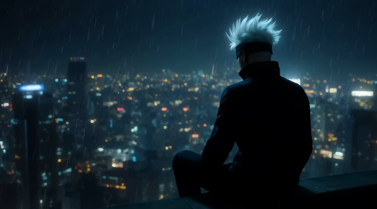 Ночь, дождь, крыша высотки, белые волосы и повязка на глазах, такой знакомый образ, но здесь он другой, не на поле боя, а в паузе между ударами. Город под ним весь в сияние неона, размыт каплями, кругом тихо, холодно, и в этом молчании читается и сила, и усталость. Это кадр о одиночестве и мыслях, о человеке, который умеет быть спокойным посередине хаоса. Медленные вспышки света на мокром асфальте, ветра в волосах и ритм дождя создают почти гипнотическое настроение которое легко представить как живые обои на рабочий стол: движение капель, мерцание неона и плавная анимация волос.