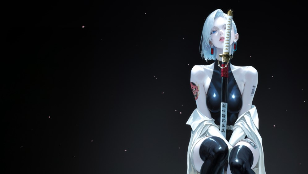 Девушка-самурай из фантастического мира, будто вышедшая из фэнтези. Короткие светлые волосы, яркие голубые глаза, а татуировки добавляют ей загадочности. Она в чёрном облегающем боди и белой куртке, а вокруг глубокий чёрный фон, который подчеркивает её образ. Такую картинку можно использовать как живые обои на ПК, анимированная заставка, что не просто красива, а еще и оживляет экран ноутбука, превращая обычный рабочий стол в настоящее небольшое приключение. Движущиеся обои передают настроение, будто персонаж готов в любой момент выйти в бой или рассказать свою историю.
