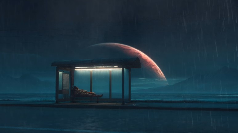Космонавт лежит на скамейке под навесом автобусной остановки и смотрит на дождь. Огромная планета висит прямо над головой закрывая полнеба, а он просто отдыхает и ждет свой автобус или звездолет, не суть важно. Такие живые обои на весь экран заставляют замереть на секунду. Холодный свет, капли, стекающие по стеклу, и это спокойное одиночество среди бесконечности, нет спешки, нет суеты, только тишина и мокрый асфальт где-то далеко-далеко от дома.