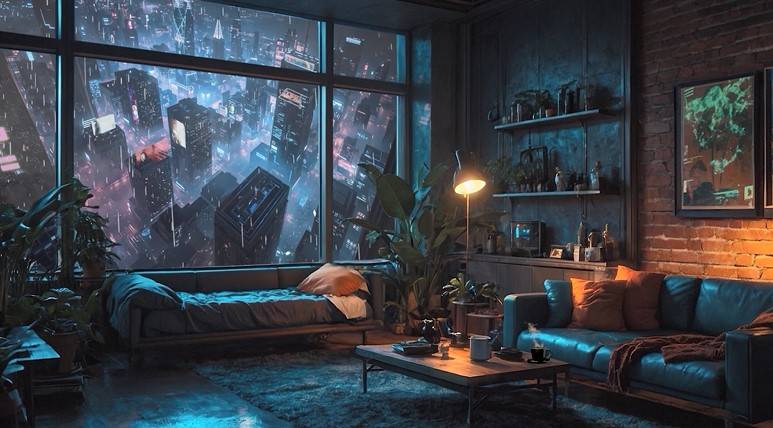 В этой гостиной ночь оживает, мягкие диваны манят присесть, растения шепчут зеленью у кирпичных стен, всё так по-домашнему, а за панорамными окнами мегаполис пульсирует неоном: башни в огнях, улицы в потоке света. Торшеры и экраны на стенах добавляют тепла тёмным тонам и город за окном задышит, не выключаясь. Такую атмосферу сейчас редко встретишь, так и хочется сохранить это ощущение рядом, ведь живые обои передают настроение лучше статичного снимка, сохраняя движение света, тени и жизни города.