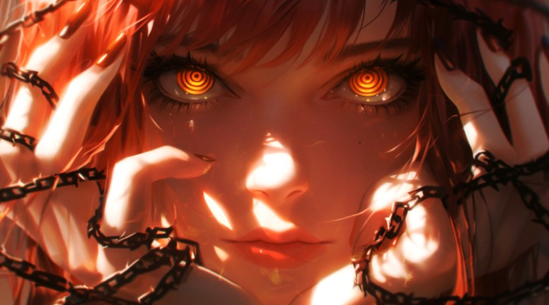 Статичная картинка не передаёт напряжения. Другое дело живые обои на пк, где Макима смотрит в упор, оранжевые глаза с кругами держат фокус, цепи вокруг шевелятся, будто дышат. Такой живой фон напоминает контроль не просто сила, а бремя. Честно, лучше раз увидеть, чем читать описания. Опутана, но спокойна. Завораживает.