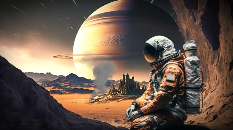 Взгляд упирается в планету, похожую на Сатурн, одинокая фигура в скафандре на камне, тишина и кольца планеты, вокруг россыпь камней, клочья газа и бесконечное звездное небо. Никакой спешки, только тишина и созерцание. Звезды мерцают едва заметно, дымка ползёт по грунту. Астронавт не двигается, он просто смотрит и вам не надо ничего делать. Подходит как живые обои на весь экран, никаких лишних деталей, один глубокий кадр.